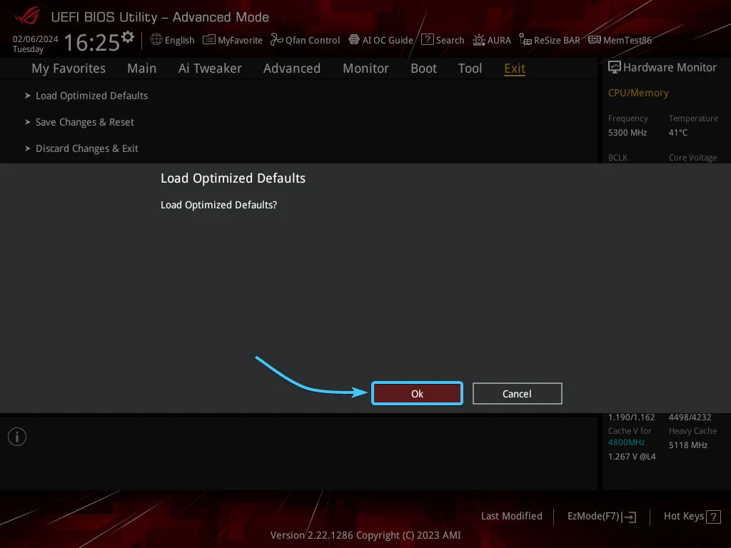 سوف تظر اليك نافذة تاكيد ، انقر على زر “موافق” لإعادة ضبط إعدادات BIOS